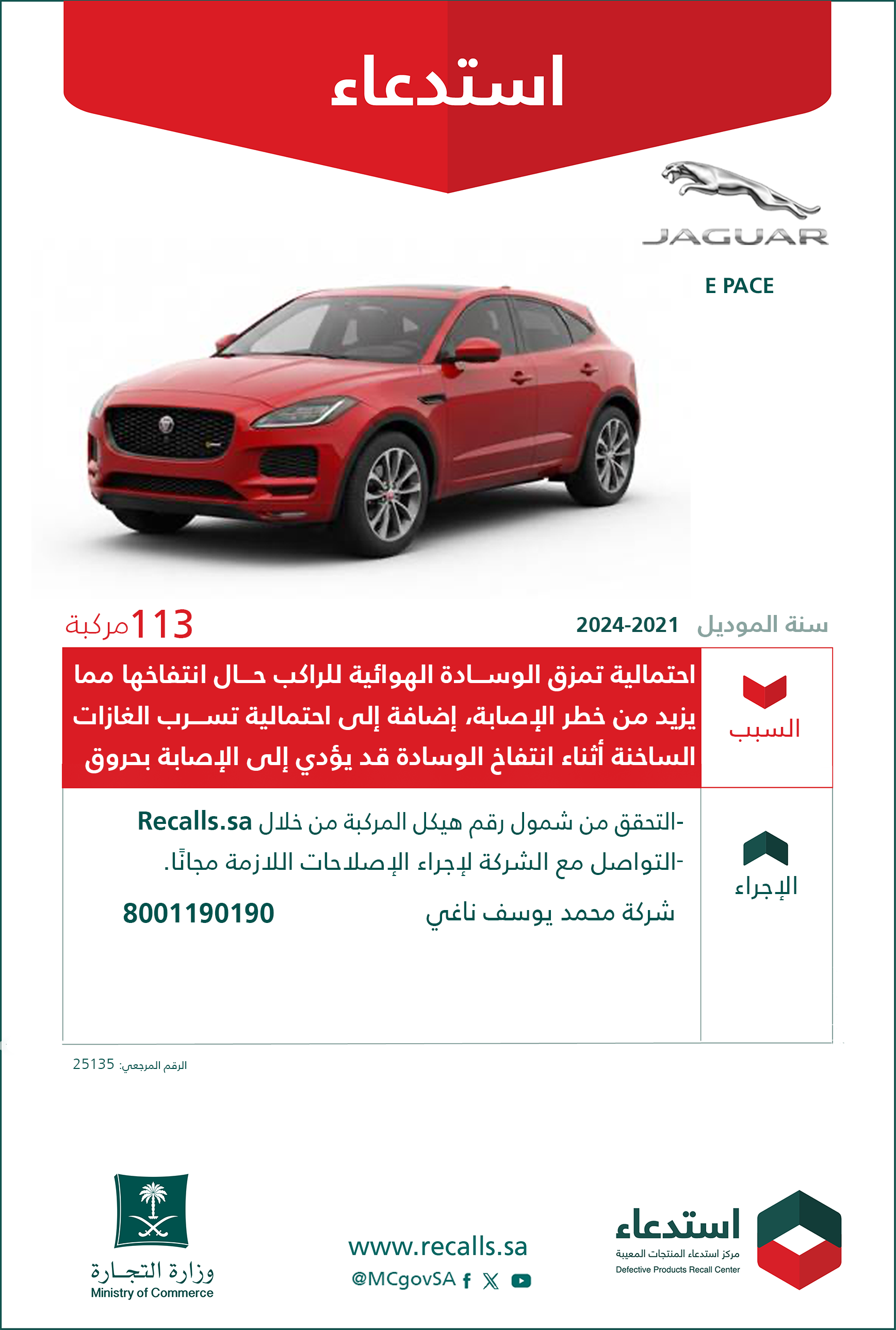 الإجراء:التواصل مع الشركة لإجراء الإصلاحات اللازمة مجاناً