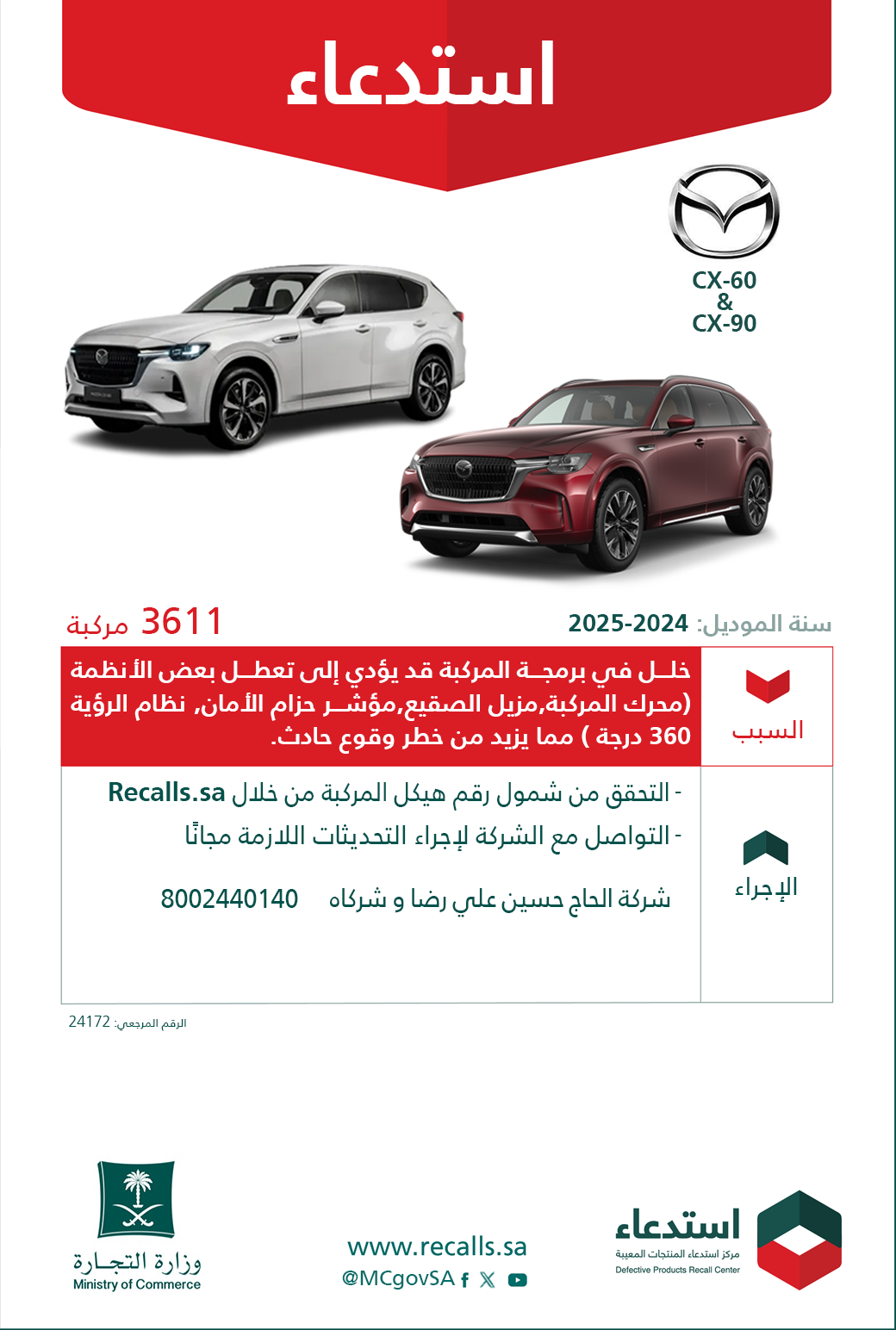 السبب:خلل في برمجة أنظمة المركبة قد يؤدي إلى توقف عمل ما يلي (محرك المركبة,مزيل الصقيع,مؤشر حزام الأمان, نظام الرؤية 360 درجة ) مما يزيد من خطر وقوع حادث.