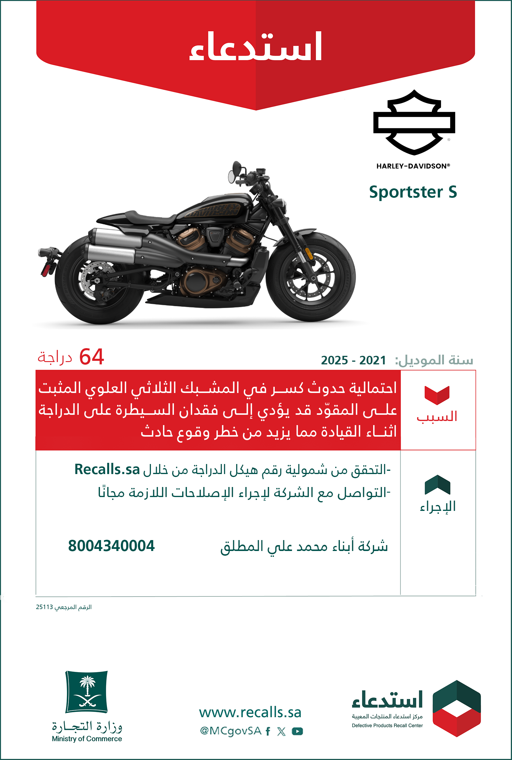 السبب:احتمالية حدوث كسر في المشبك الثلاثي العلوي المثبت على المقوّد قد يؤدي إلى فقدان السيطرة على الدراجة اثناء القيادة مما يزيد من خطر وقوع حادث